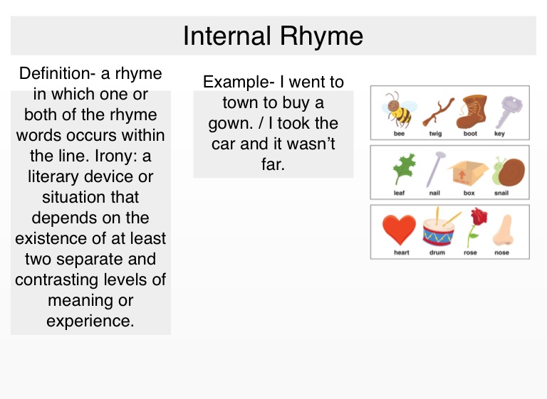Definition- a rhyme in which one or both of the rhyme words occurs within the line. Irony: a literary device or situation that depends on the existence of at least two separate and contrasting levels of meaning or experience.