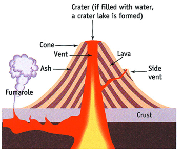 The volcano is made out of layers of ash and lava. A day that the volcano erupts it can erupt ash, and other time it can erupt lava. It keeps on doing that until it is extinct.