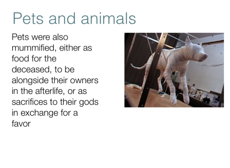 Pets were also mummified, either as food for the deceased, to be alongside their owners in the afterlife, or as sacrifices to their gods in exchange for a favor
