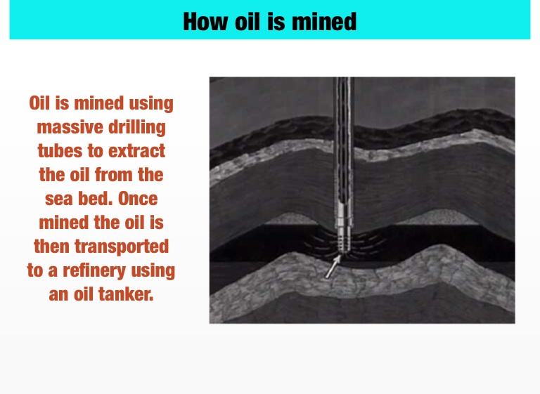 Oil is mined using massive drilling tubes to extract the oil from the sea bed. Once mined the oil is then transported to a refinery using an oil tanker.