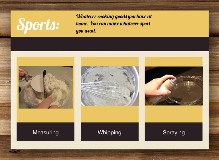 Whatever cooking goods you have at home. You can make whatever sport you want.