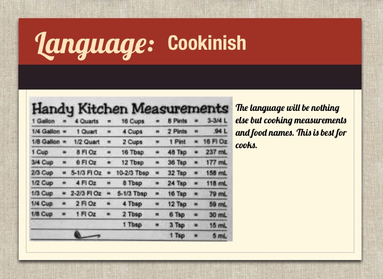 The language will be nothing else but cooking measurements and food names. This is best for cooks.