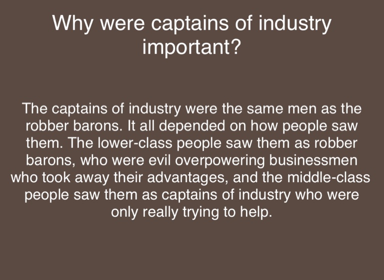The captains of industry were the same men as the robber barons. It all depended on how people saw them. The lower-class people saw them as robber barons, who were evil overpowering businessmen who took away their advantages, and the middle-class people saw them as captains of industry who were only really trying to help.