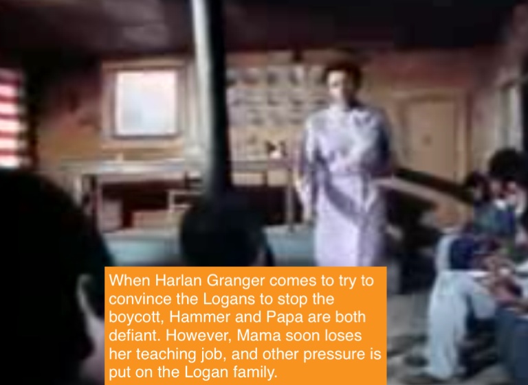 When Harlan Granger comes to try to convince the Logans to stop the boycott, Hammer and Papa are both defiant. However, Mama soon loses her teaching job, and other pressure is put on the Logan family.