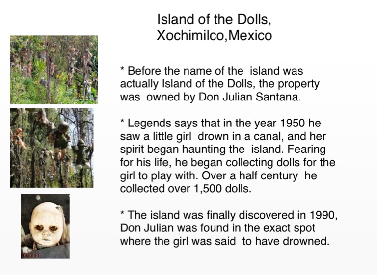 * Legends says that in the year 1950 he saw a little girl drown in a canal, and her spirit began haunting the island. Fearing for his life, he began collecting dolls for the girl to play with. Over a half century he collected over 1,500 dolls.