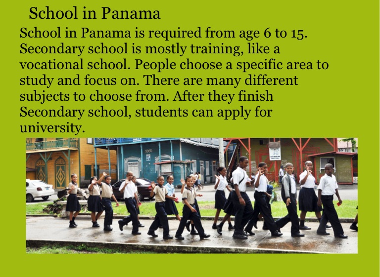 School in Panama is required from age 6 to 15. Secondary school is mostly training, like a vocational school. People choose a specific area to study and focus on. There are many different subjects to choose from. After they finish Secondary school, students can apply for university.