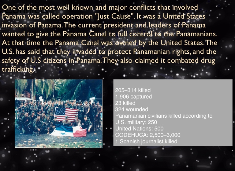 One of the most well known and major conflicts that involved Panama was called operation "Just Cause". It was a United States invasion of Panama. The current president and leaders of Panama wanted to give the Panama Canal to full control to the Panamanians. At that time the Panama Canal was owned by the United States. The U.S. has said that they invaded to protect Panamanian rights, and the safety of U.S citizens in Panama. They also claimed it combated drug trafficking.