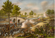The Army of the Potomac, under the command of George McClellan, mounted a series of powerful assaults against Robert E. Lee’s forces near Sharpsburg, Maryland, on September 17, 1862. The morning assault and vicious Confederate counterattacks swept back and forth through Miller’s Cornfield and the West Woods. Later, towards the center of the battlefield, Union assaults against the Sunken Road pierced the Confederate center after a terrible struggle. Late in the day, the third and final major assault by the Union army pushed over a bullet-strewn stone bridge at Antietam Creek. Just as the Federal forces began to slowly decrease the Confederate right, the timely arrival of A.P. Hill’s division from Harpers Ferry helped to drive the Army of the Potomac back once more. The bloodiest single day in American military history ended in a draw, but the Confederate retreat gave Abraham Lincoln the “victory” he desired before issuing the Emancipation Proclamation.
