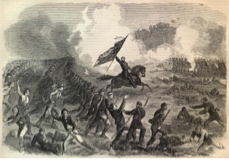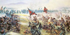 Confederate Gen. Robert E. Lee concentrated his army around Gettysburg, Pennsylvania, upon the approach of Union Gen. George G. Meade’s forces. On July 1, Confederates drove Union defenders through Gettysburg to Cemetery Hill. The next day Lee struck the of the Union line resulting in severe fighting at Devil's Den, Little Round Top, the Wheatfield, Peach Orchard, Culp’s Hill and East Cemetery Hill. Southerners gained ground but failed to destroy the Union host. On the morning of July 3rd, fighting continued on at Culp’s Hill with the Union regaining its lost ground. That afternoon, after a massive artillery bombardment, Lee attacked the Union center on Cemetery Ridge and was dissapointed with heavy losses in what is known as Pickett’s Charge. Lee's second invasion of the North had failed.