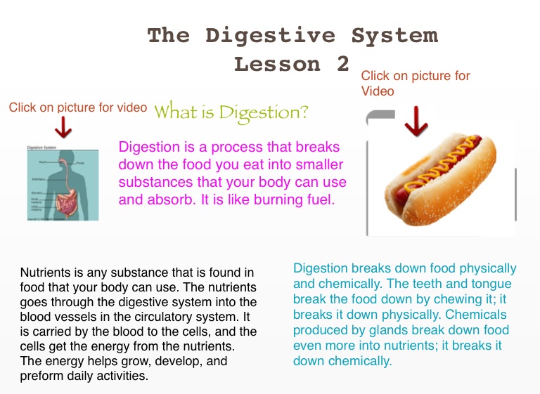 Digestion is a process that breaks down the food you eat into smaller substances that your body can use and absorb. It is like burning fuel.