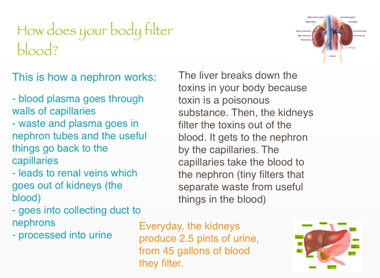 The liver breaks down the toxins in your body because toxin is a poisonous substance. Then, the kidneys filter the toxins out of the blood. It gets to the nephron by the capillaries. The capillaries take the blood to the nephron (tiny filters that separate waste from useful things in the blood)