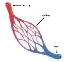 Capillaries are tiny vessels that connect to arteries and veins. Gas exchange of carbon dioxide and oxygen take place in the thin walls of the capillaries. The oxygen and carbon dioxide pass through the walls of the capillaries. Then they are picked up by red blood cells.