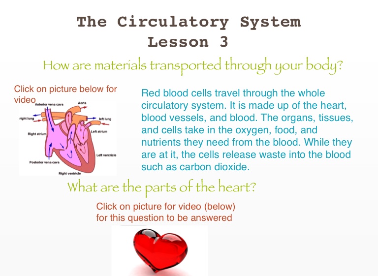 Red blood cells travel through the whole circulatory system. It is made up of the heart, blood vessels, and blood. The organs, tissues, and cells take in the oxygen, food, and nutrients they need from the blood. While they are at it, the cells release waste into the blood such as carbon dioxide.