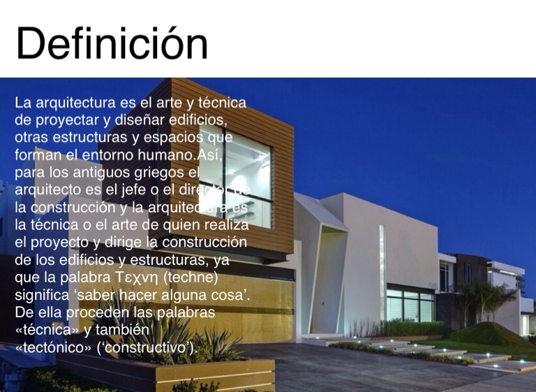 La arquitectura es el arte y técnica de proyectar y diseñar edificios, otras estructuras y espacios que forman el entorno humano.Así, para los antiguos griegos el arquitecto es el jefe o el director de la construcción y la arquitectura es la técnica o el arte de quien realiza el proyecto y dirige la construcción de los edificios y estructuras, ya que la palabra Τεχνη (techne) significa ‘saber hacer alguna cosa’. De ella proceden las palabras «técnica» y también «tectónico» (‘constructivo’).