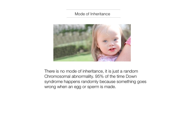 There is no mode of inheritance, it is just a random Chromosomal abnormality. 95% of the time Down syndrome happens randomly because something goes wrong when an egg or sperm is made.