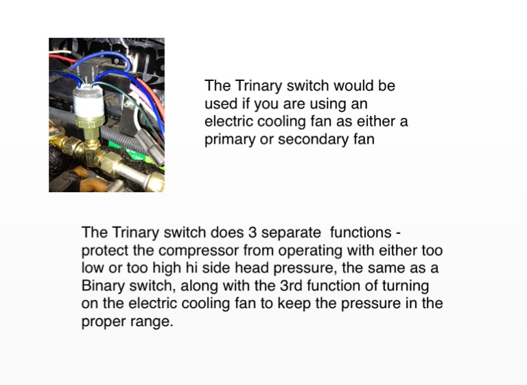 The Trinary switch does 3 separate functions - protect the compressor from operating with either too low or too high hi side head pressure, the same as a Binary switch, along with the 3rd function of turning on the electric cooling fan to keep the pressure in the proper range.