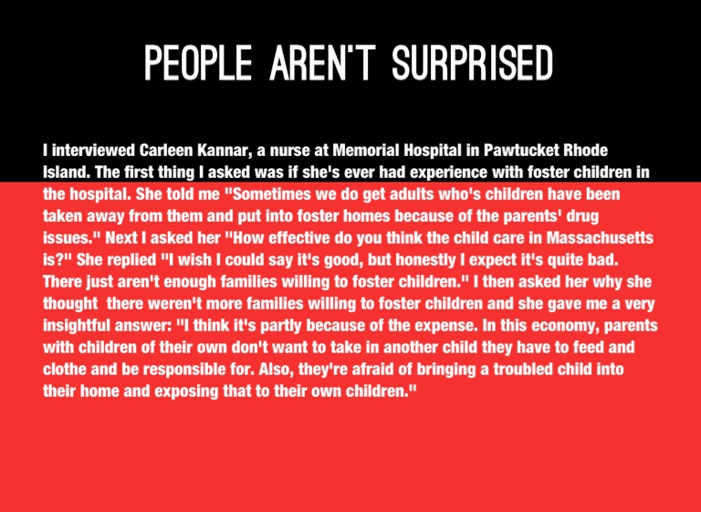 I interviewed Carleen Kannar, a nurse at Memorial Hospital in Pawtucket Rhode Island. The first thing I asked was if she's ever had experience with foster children in the hospital. She told me "Sometimes we do get adults who's children have been taken away from them and put into foster homes because of the parents' drug issues." Next I asked her "How effective do you think the child care in Massachusetts is?" She replied "I wish I could say it's good, but honestly I expect it's quite bad. There just aren't enough families willing to foster children." I then asked her why she thought there weren't more families willing to foster children and she gave me a very insightful answer: "I think it's partly because of the expense. In this economy, parents with children of their own don't want to take in another child they have to feed and clothe and be responsible for. Also, they're afraid of bringing a troubled child into their home and exposing that to their own children."
