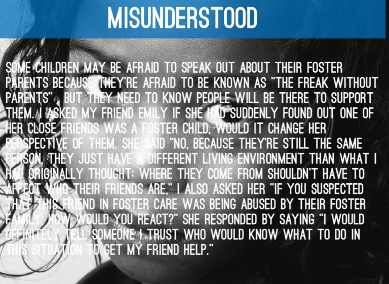 Some children may be afraid to speak out about their foster parents because they're afraid to be known as "the freak without parents" , but they need to know people will be there to support them. I asked my friend emily if she had suddenly found out one of her close friends was a foster child, would it change her perspective of them. She said "no, because they're still the same person, they just have a different living environment than what i had originally thought; where they come from shouldn't have to affect who their friends are," i also asked her "if you suspected that this friend in foster care was being abused by their foster family, how would you react?" She responded by saying "i would definitely tell someone i trust who would know what to do in this situation to get my friend help."
