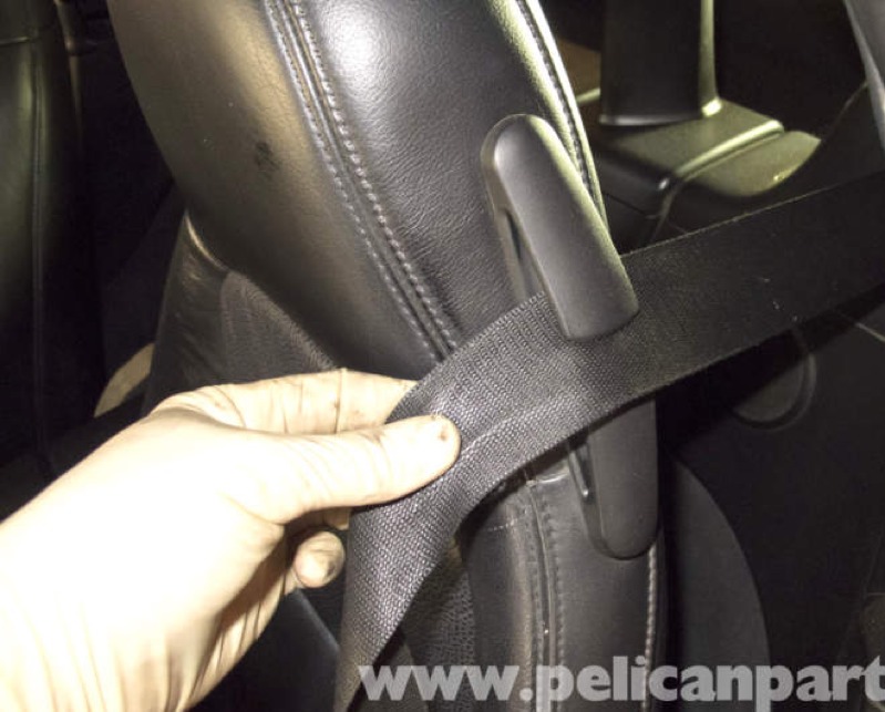 Next, remove the seat belt from the seat belt bracket on the top of the seat. Carefully slide it out and place it aside.