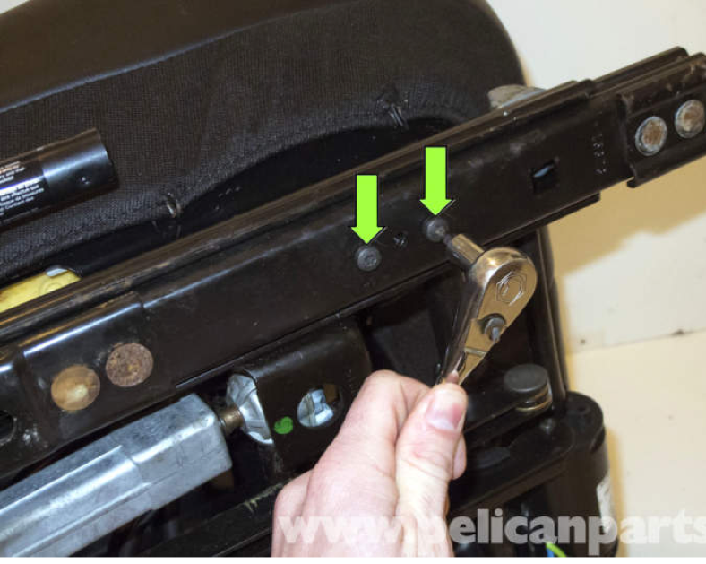 Working at the front bottom of the seal rail, remove two T25 Torx fasteners (green arrows).