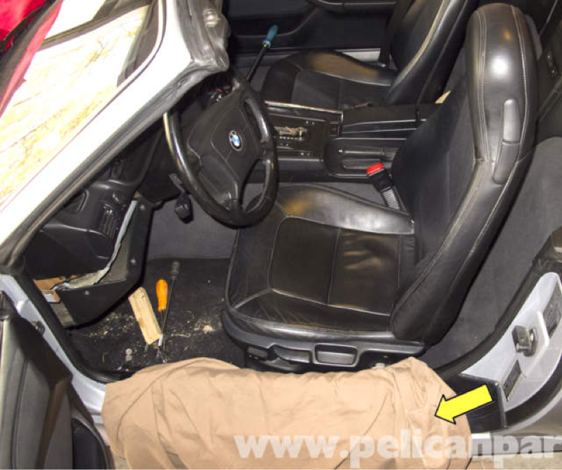 Cover seat rail with a fender cover (yellow arrow). Then open the convertible top. With the top open, grab the seat back at the bottom between the back and the seat cushion. Lift the seat out of the vehicle. Be careful not to scratch the body or trim when removing.