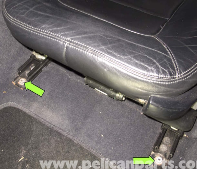 Move seat all the way back and up to highest position. Then working at the front of the seat rail, remove both 13mm seat mounting nuts (green arrow).