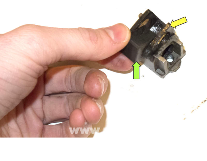 Remove the threaded adjuster (green arrow) and the rubber insulator (yellow arrow) from the mounting bracket.