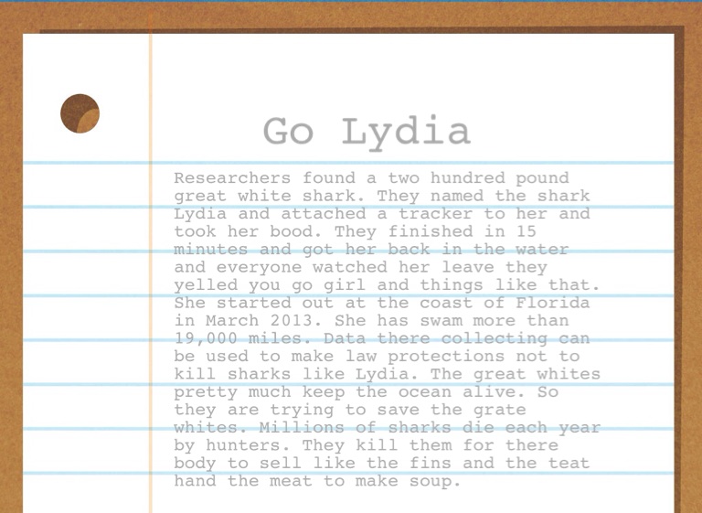 Researchers found a two hundred pound great white shark. They named the shark Lydia and attached a tracker to her and took her bood. They finished in 15 minutes and got her back in the water and everyone watched her leave they yelled you go girl and things like that. She started out at the coast of Florida in March 2013. She has swam more than 19,000 miles. Data there collecting can be used to make law protections not to kill sharks like Lydia. The great whites pretty much keep the ocean alive. So they are trying to save the grate whites. Millions of sharks die each year by hunters. They kill them for there body to sell like the fins and the teat hand the meat to make soup.