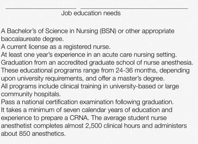 Graduation from an accredited graduate school of nurse anesthesia. These educational programs range from 24-36 months, depending upon university requirements, and offer a master’s degree.