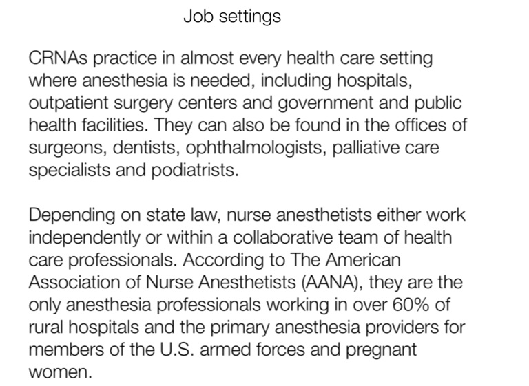 CRNAs practice in almost every health care setting where anesthesia is needed, including hospitals, outpatient surgery centers and government and public health facilities. They can also be found in the offices of surgeons, dentists, ophthalmologists, palliative care specialists and podiatrists.