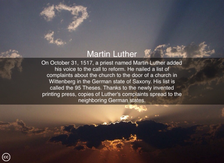 On October 31, 1517, a priest named Martin Luther added his voice to the call to reform. He nailed a list of complaints about the church to the door of a church in Wittenberg in the German state of Saxony. His list is called the 95 Theses. Thanks to the newly invented printing press, copies of Luther's complaints spread to the neighboring German states.