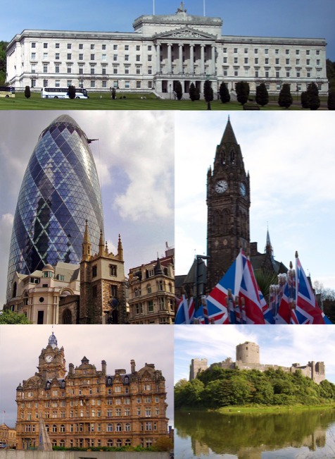 These buildings are Stormont, 30 St. Mary Axe, Big Ben, Balmoral Hotel, Pembroke Castle.