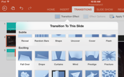 PowerPoint comes chock full of transitions with over 30 different transitions to choose from. You can apply to each slide, or there is an option to apply to all slides, which is a nice, convenient feature.