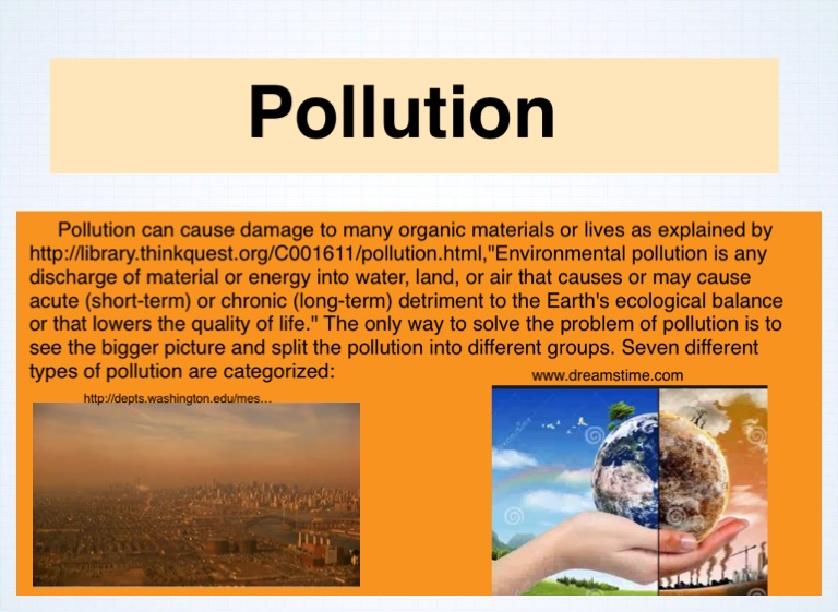 Pollution can cause damage to many organic materials or lives as explained by http://library.thinkquest.org/C001611/pollution.html,"Environmental pollution is any discharge of material or energy into water, land, or air that causes or may cause acute (short-term) or chronic (long-term) detriment to the Earth's ecological balance or that lowers the quality of life." The only way to solve the problem of pollution is to see the bigger picture and split the pollution into different groups. Seven different types of pollution are categorized:
