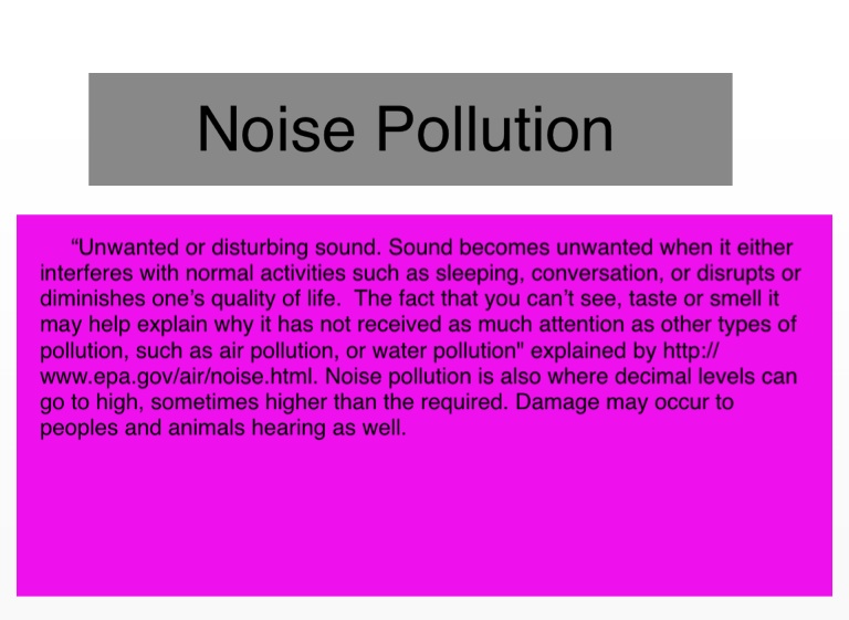 “Unwanted or disturbing sound. Sound becomes unwanted when it either interferes with normal activities such as sleeping, conversation, or disrupts or diminishes one’s quality of life. The fact that you can’t see, taste or smell it may help explain why it has not received as much attention as other types of pollution, such as air pollution, or water pollution" explained by http://www.epa.gov/air/noise.html. Noise pollution is also where decimal levels can go to high, sometimes higher than the required. Damage may occur to peoples and animals hearing as well.