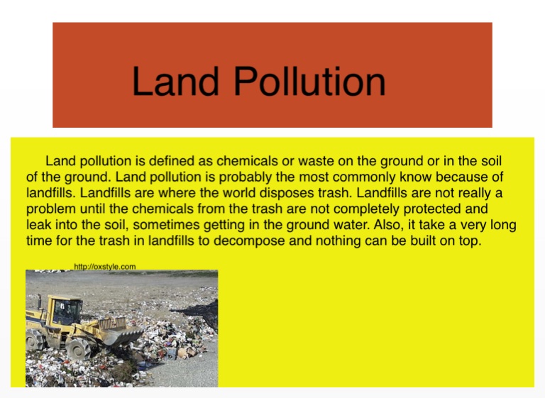 Land pollution is defined as chemicals or waste on the ground or in the soil of the ground. Land pollution is probably the most commonly know because of landfills. Landfills are where the world disposes trash. Landfills are not really a problem until the chemicals from the trash are not completely protected and leak into the soil, sometimes getting in the ground water. Also, it take a very long time for the trash in landfills to decompose and nothing can be built on top.