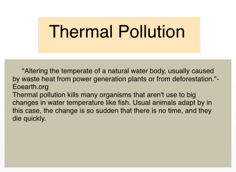 "Altering the temperate of a natural water body, usually caused by waste heat from power generation plants or from deforestation."-Eoearth.org