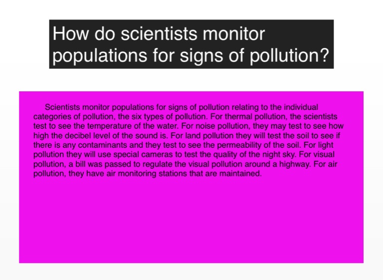 Scientists monitor populations for signs of pollution relating to the individual categories of pollution, the six types of pollution. For thermal pollution, the scientists test to see the temperature of the water. For noise pollution, they may test to see how high the decibel level of the sound is. For land pollution they will test the soil to see if there is any contaminants and they test to see the permeability of the soil. For light pollution they will use special cameras to test the quality of the night sky. For visual pollution, a bill was passed to regulate the visual pollution around a highway. For air pollution, they have air monitoring stations that are maintained.