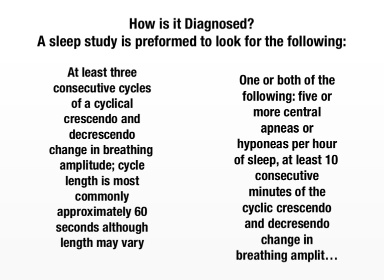 One or both of the following: five or more central apneas or hyponeas per hour of sleep, at least 10 consecutive minutes of the cyclic crescendo and decresendo change in breathing amplitude