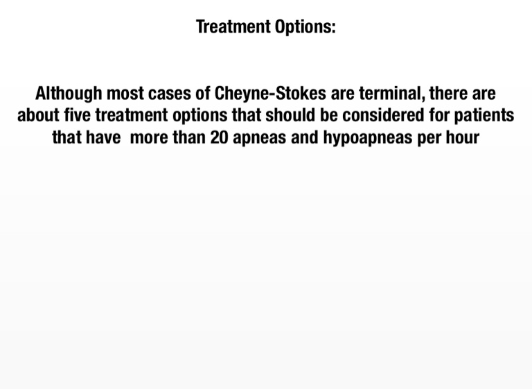Although most cases of Cheyne-Stokes are terminal, there are about five treatment options that should be considered for patients that have more than 20 apneas and hypoapneas per hour