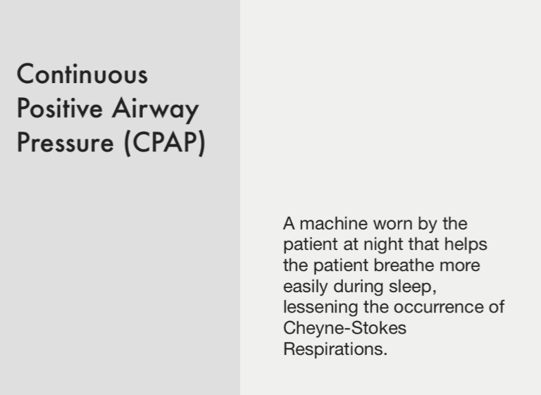 A machine worn by the patient at night that helps the patient breathe more easily during sleep, lessening the occurrence of Cheyne-Stokes Respirations.