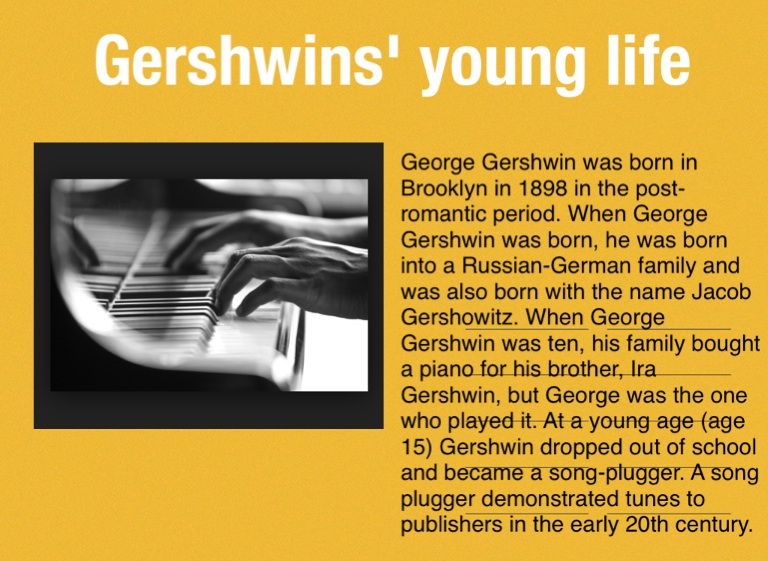 George Gershwin was born in Brooklyn in 1898 in the post-romantic period. When George Gershwin was born, he was born into a Russian-German family and was also born with the name Jacob Gershowitz. When George Gershwin was ten, his family bought a piano for his brother, Ira Gershwin, but George was the one who played it. At a young age (age 15) Gershwin dropped out of school and became a song-plugger. A song plugger demonstrated tunes to publishers in the early 20th century.