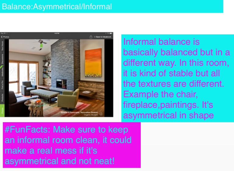 Informal balance is basically balanced but in a different way. In this room, it is kind of stable but all the textures are different. Example the chair, fireplace,paintings. It's asymmetrical in shape