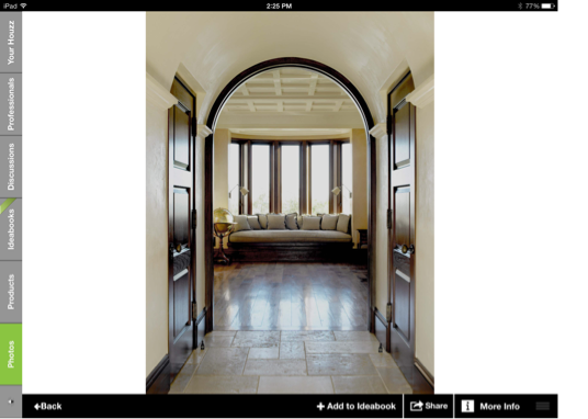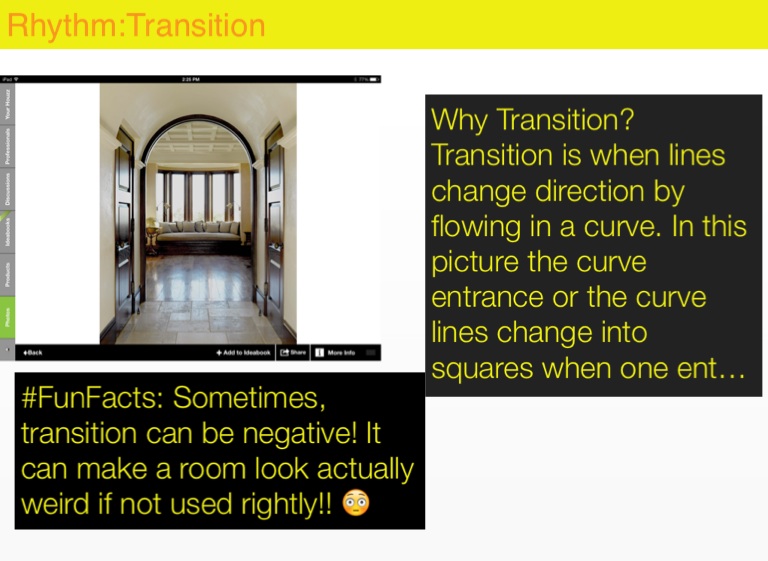 Transition is when lines change direction by flowing in a curve. In this picture the curve entrance or the curve lines change into squares when one enters a room.