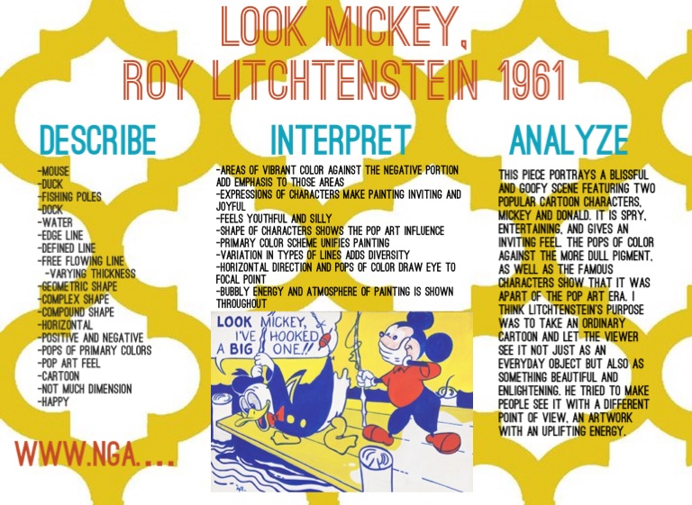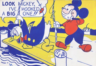 This piece portrays a blissful and goofy scene featuring two popular cartoon characters, Mickey and Donald. It is spry, entertaining, and gives an inviting feel. The pops of color against the more dull pigment, as well as the famous characters show that it was apart of the pop art era. I think litchtenstein's purpose was to take an ordinary cartoon and let the viewer see it not just as an everyday object but also as something beautiful and enlightening. He tried to make people see it with a different point of view, an artwork with an uplifting energy.