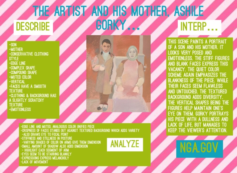 This scene paints a portrait of a son and his mother. It looks very posed and emotionless. The stiff figures and blank faces express this vacancy. The quiet color scheme again emphasizes the blankness of the piece. While their faces seem flawless and untouched, the textured background adds diversity. The vertical shapes being the figures help maintain one's eye on them. Gorky portrays his piece with a dullness and lack of life, but manages to keep the viewer's attention.