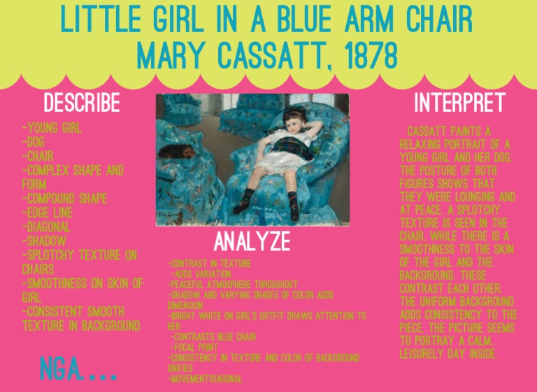 Cassatt paints a relaxing portrait of a young girl and her dog. The posture of both figures shows that they were lounging and at peace. A splotchy texture is seen in the chair, while there is a smoothness to the skin of the girl and the background. These contrast each other. The uniform background adds consistency to the piece. The picture seems to portray a calm, leisurely day inside.