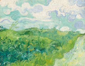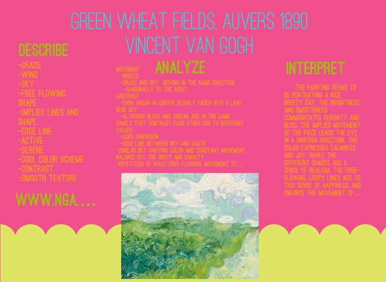 The painting seems to be portraying a nice, breezy day. The brightness and smoothness communicates serenity and bliss. The implied movement of the piece leads the eye in a uniform direction. The color expresses calmness and joy, while the different shades add a sense of realism. The free-flowing, loopy lines add to this sense of happiness, and enforce the movement of the painting.