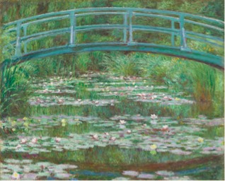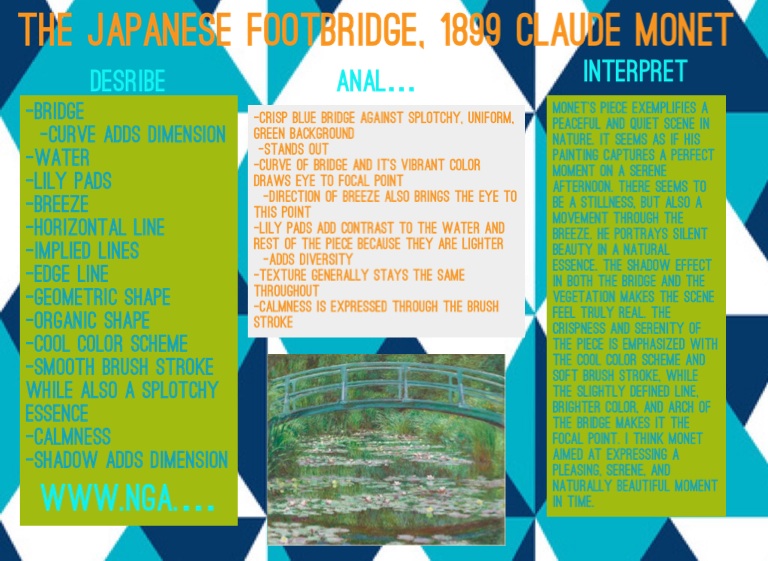 Monet's piece exemplifies a peaceful and quiet scene in nature. It seems as if his painting captures a perfect moment on a serene afternoon. There seems to be a stillness, but also a movement through the breeze. He portrays silent beauty in a natural Essence. The shadow effect in both the bridge and the vegetation makes the scene feel truly real. The crispness and serenity of the piece is emphasized with the cool color scheme and soft brush stroke, while the slightly defined line, brighter color, and arch of the bridge makes it the focal point. I think Monet aimed at expressing a pleasing, serene, and naturally beautiful moment in time.