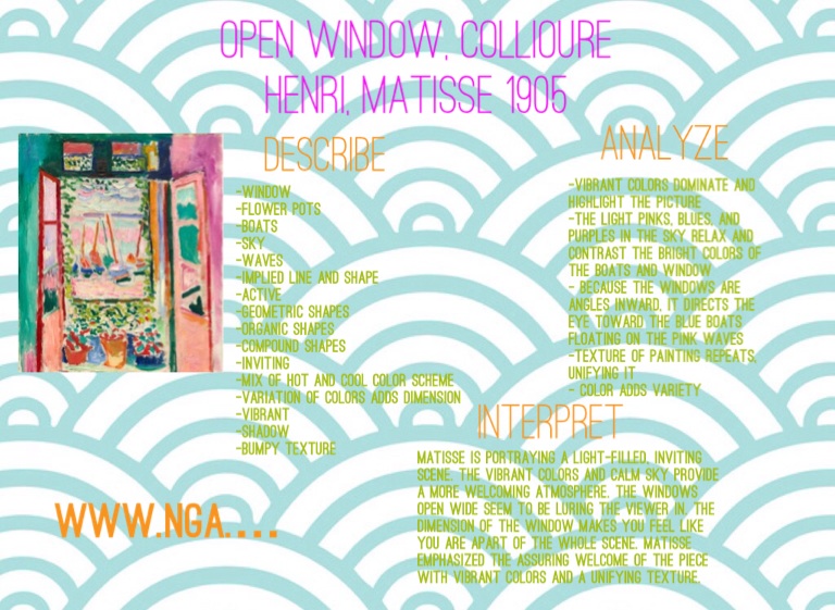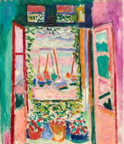 Matisse is portraying a light-filled, inviting scene. The vibrant colors and calm sky provide a more welcoming atmosphere. The windows open wide seem to be luring the viewer in. The dimension of the window makes you feel like you are apart of the whole scene. Matisse emphasized the assuring welcome of the piece with vibrant colors and a unifying texture.